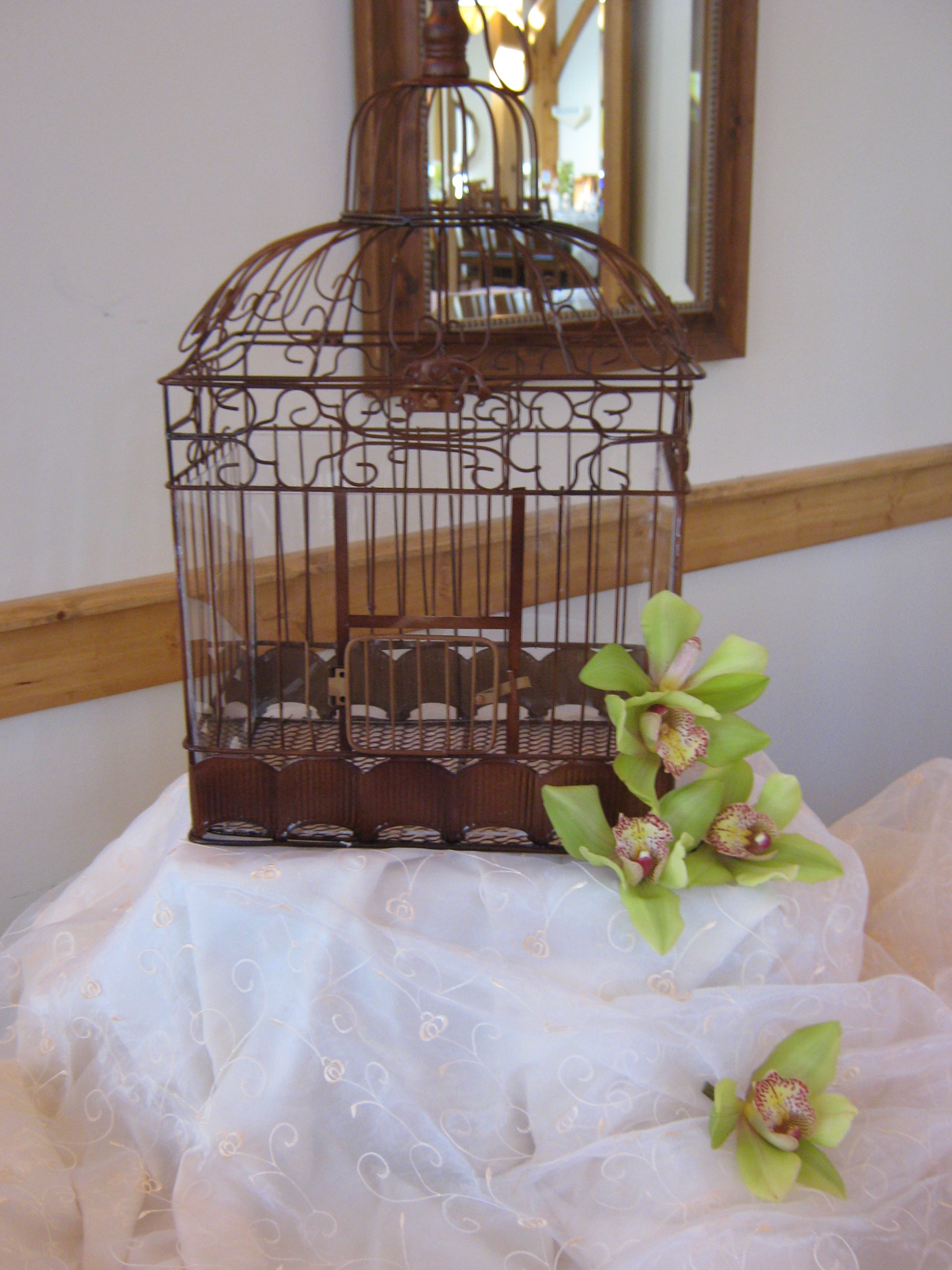 Chinese Lanterns, greenery, roses, calla lilies and roses create a unique card holder when surrounding a bird cage.