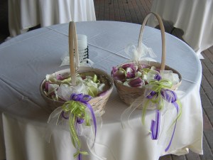 Baskets of rose petals will be held by ushers so guests may take a handful to toss onto the bride and groom as they exit the ceremony area.