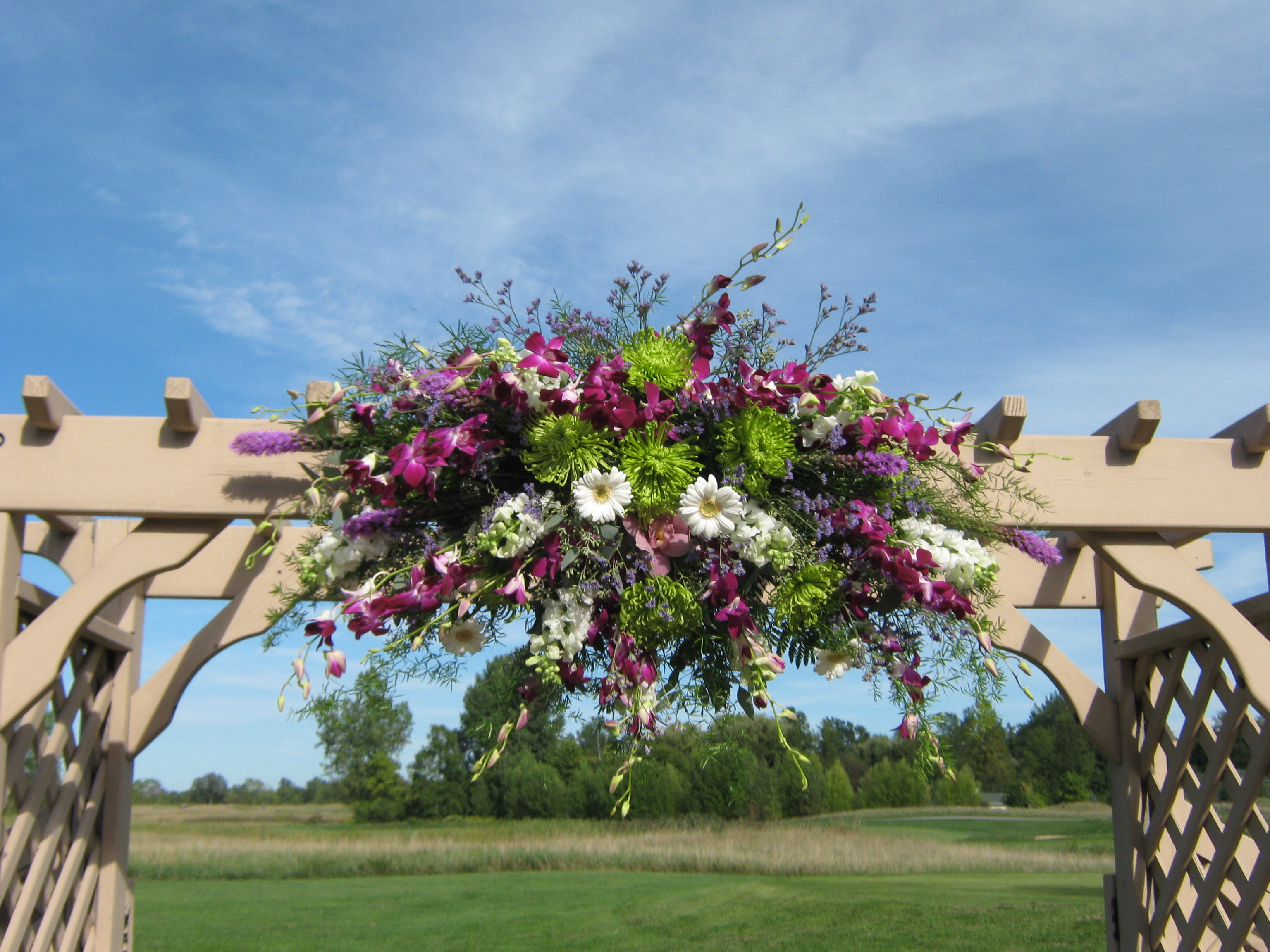 Orchids, Mums, and other assorted wildflowers in purples and greens add a personal touch to the ceremony arch.
