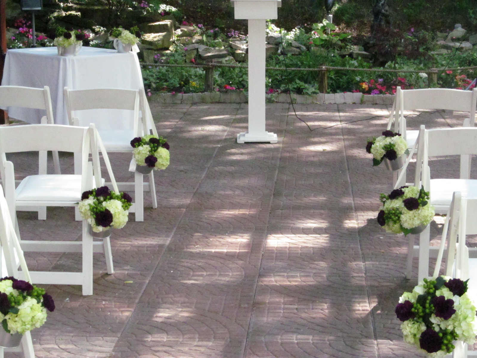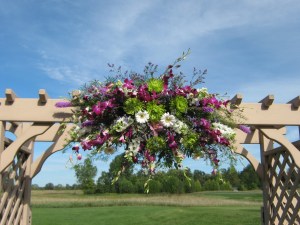 A beautiful arrangement of purple and green flowers accents the top of the arch where the bride & groom are to be married.  Mum plants enhance the breathtaking scenery and create an ambiance where the ceremony is to be held.