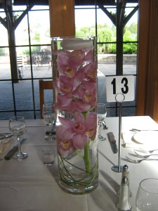 Simple centerpieces of orchids submerged in cylinders are accented by floating candles.  A modern yet elegant choice, we offer these cylinder containers for rental.  Our designers carefully assemble the centerpieces and deliver them to your reception for a hassle-free wedding day.