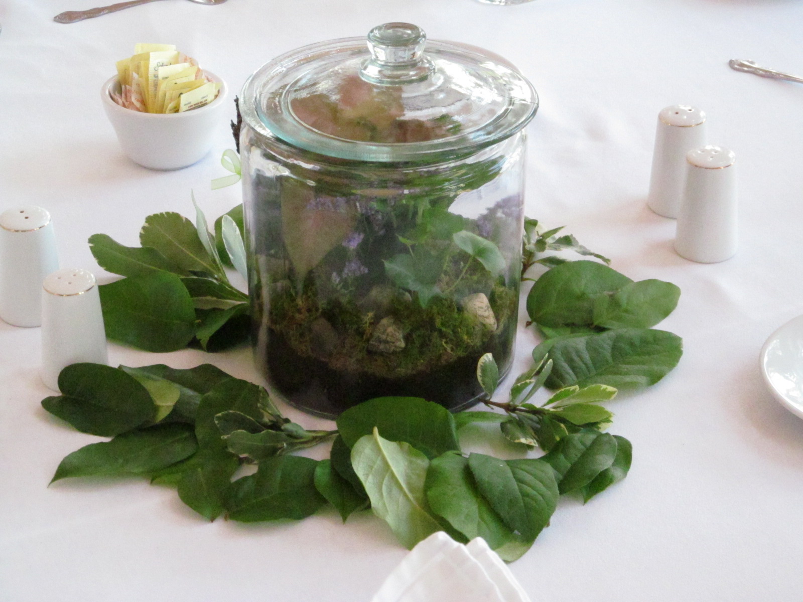Green house plants are accented with a touch of purple flowers in a terrarium and surrounded by loose greenery.  The terrariums can be taken home by guests and kept in their homes to grow on for years as a memory of the wedding day.