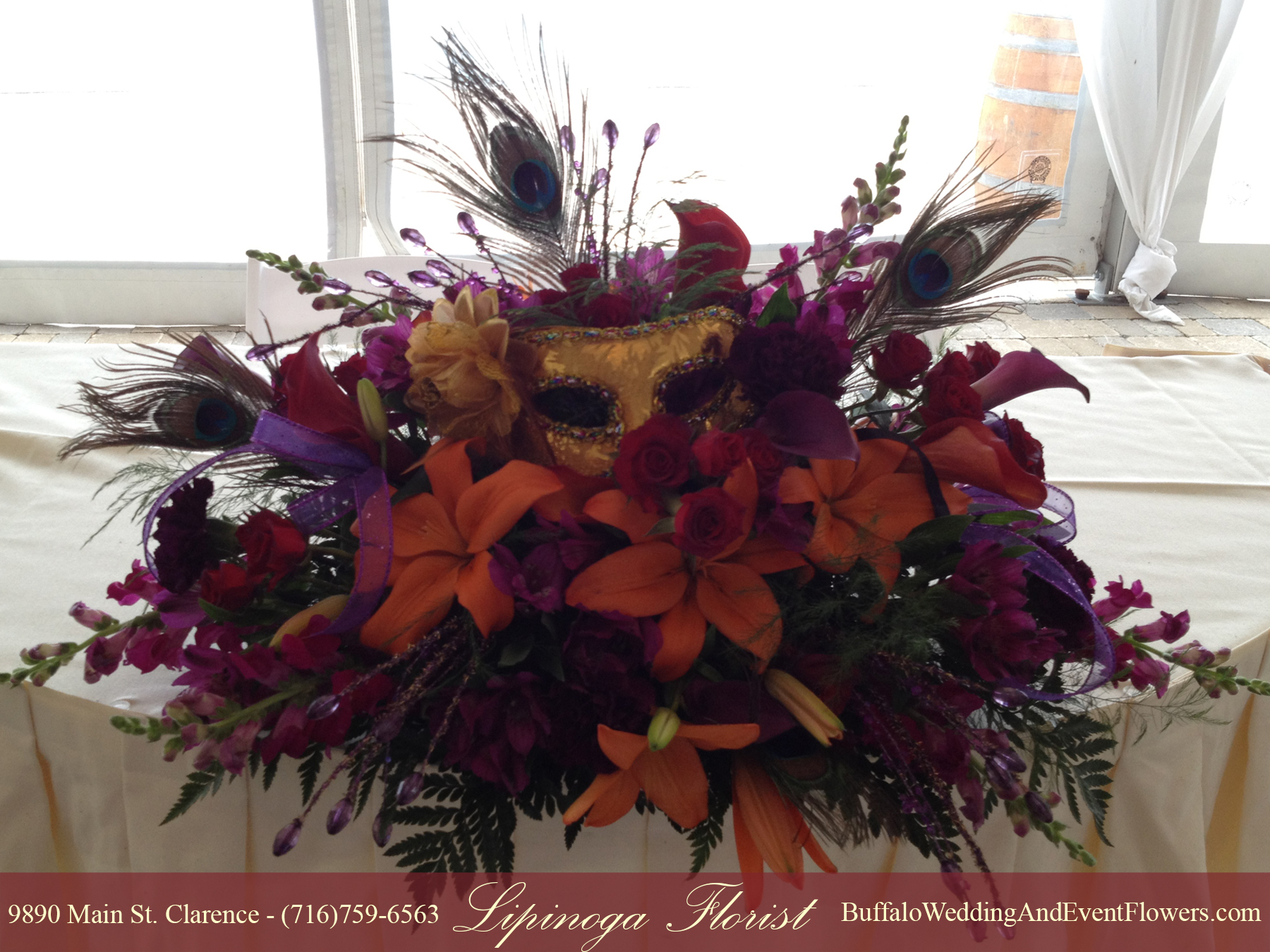 Happy Mardi Gras! In honor of Fat Tuesday, today, we are sharing a beautiful fall masquerade wedding held at the Inn on the Lake in Canandaigua, NY. Fall colored blossoms in shades of burgandy, purple and orange created a festive yet autumnal atmosphere for this wedding reception.