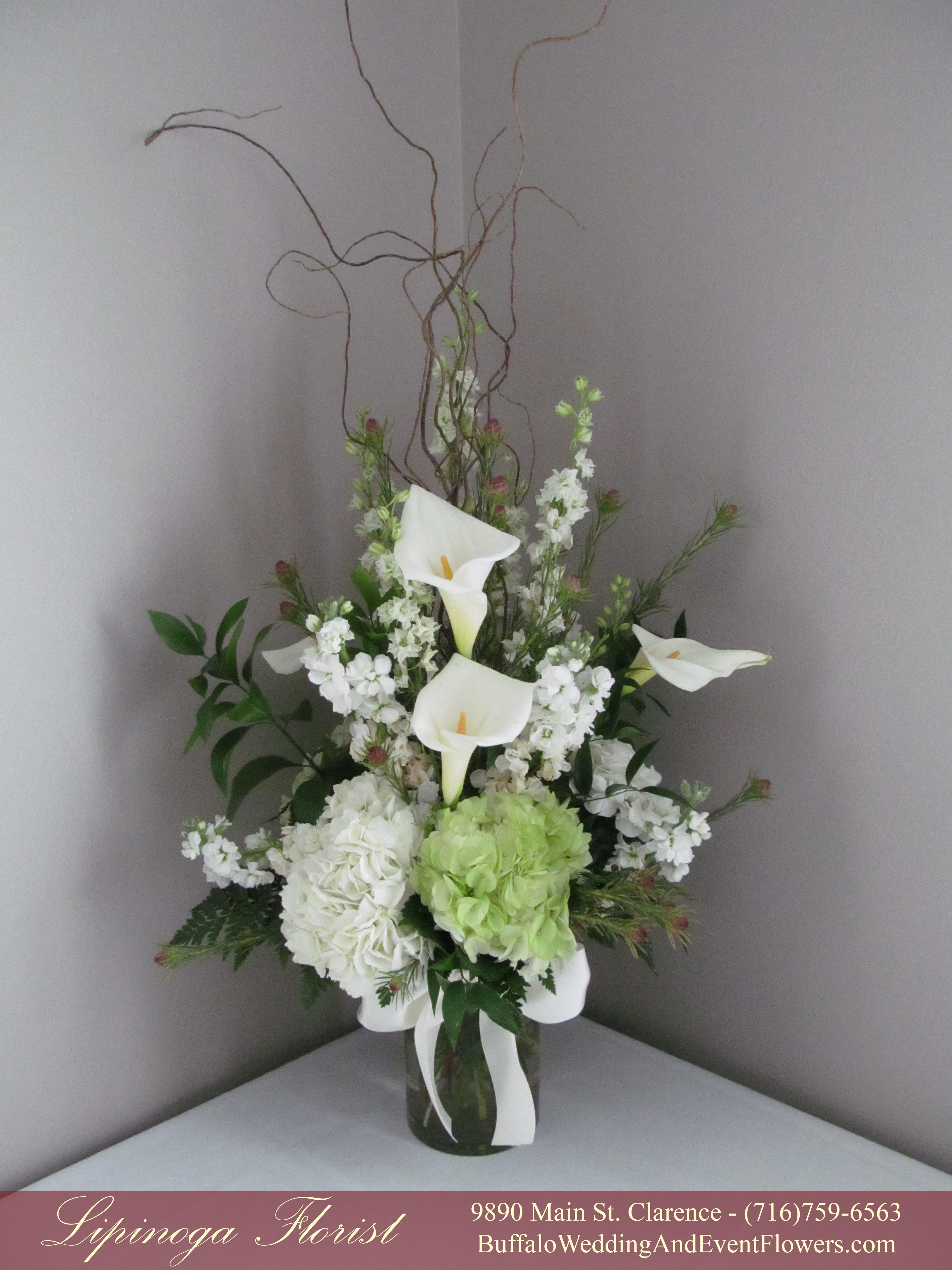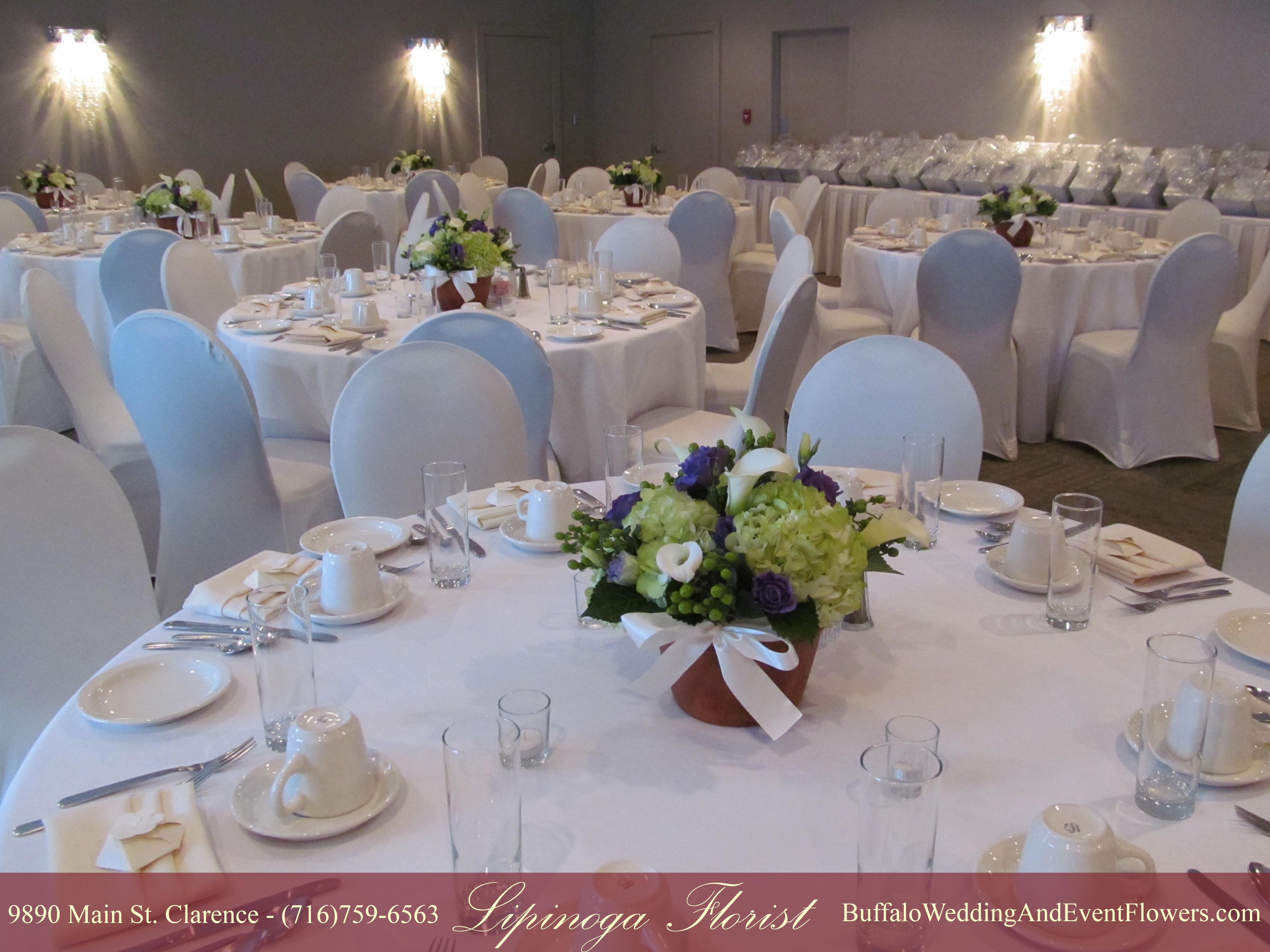 Fuji Mums are a large spikey variety of mum available in lime green, white, lavender and yellow. They are a wonderful focal flower for centerpieces or ceremony and reception décor. Both green and white fuji mums along with smaller green mums are used in reception flowers for a wedding at Westwood Country Club in Amherst, NY.