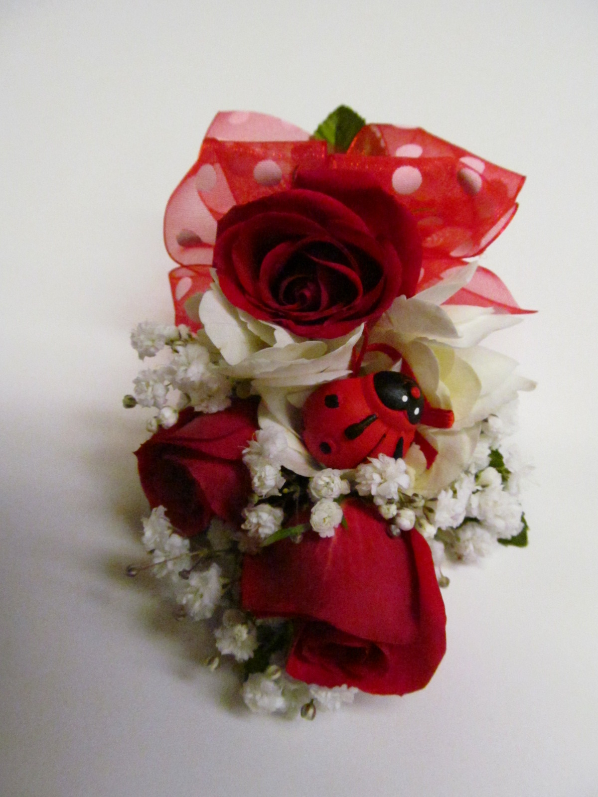 A taller vase arrangement is perfect for an accent table. A small ladybug is placed in a corsage for the mom-to-be to follow through with the theme.