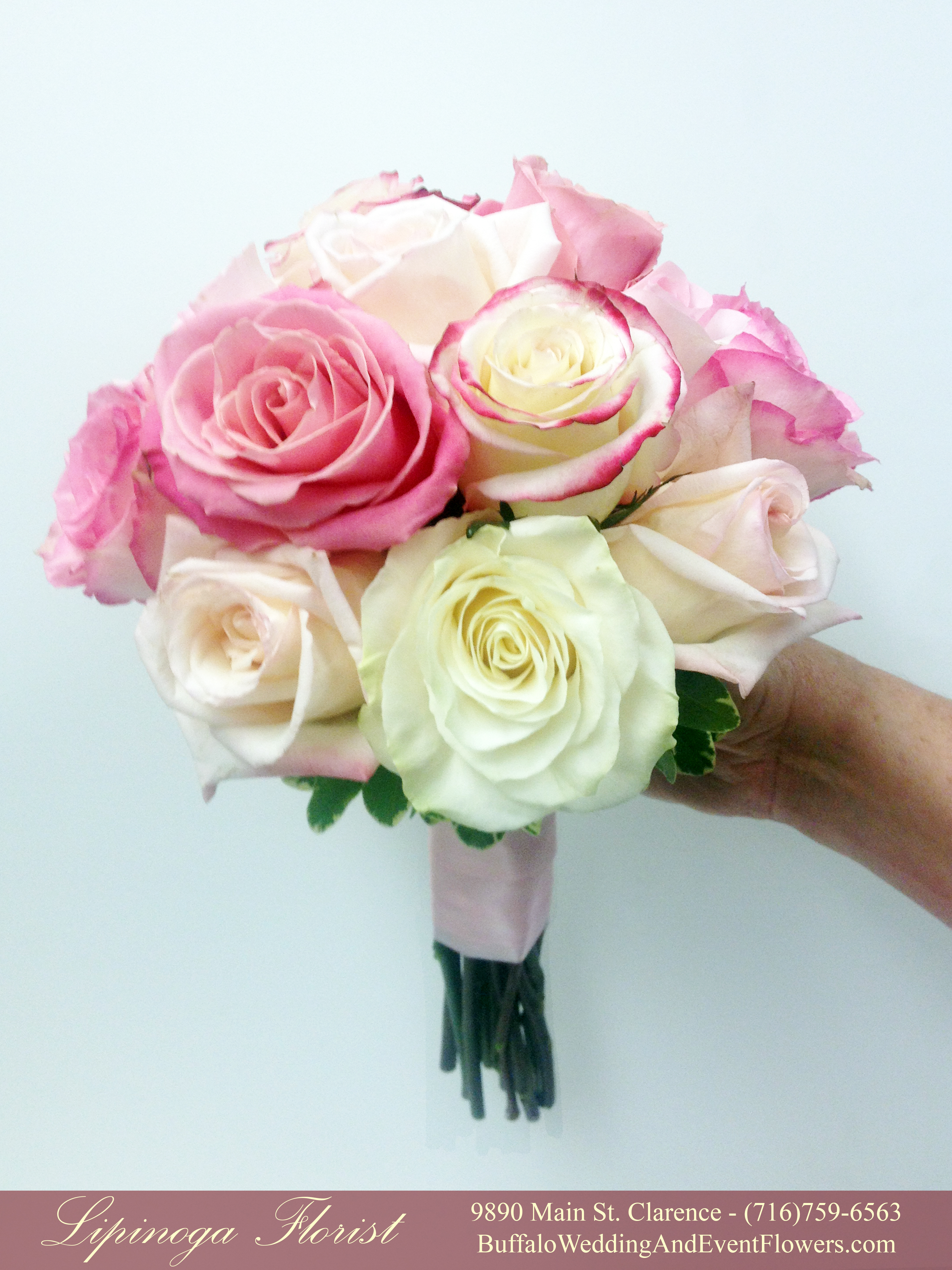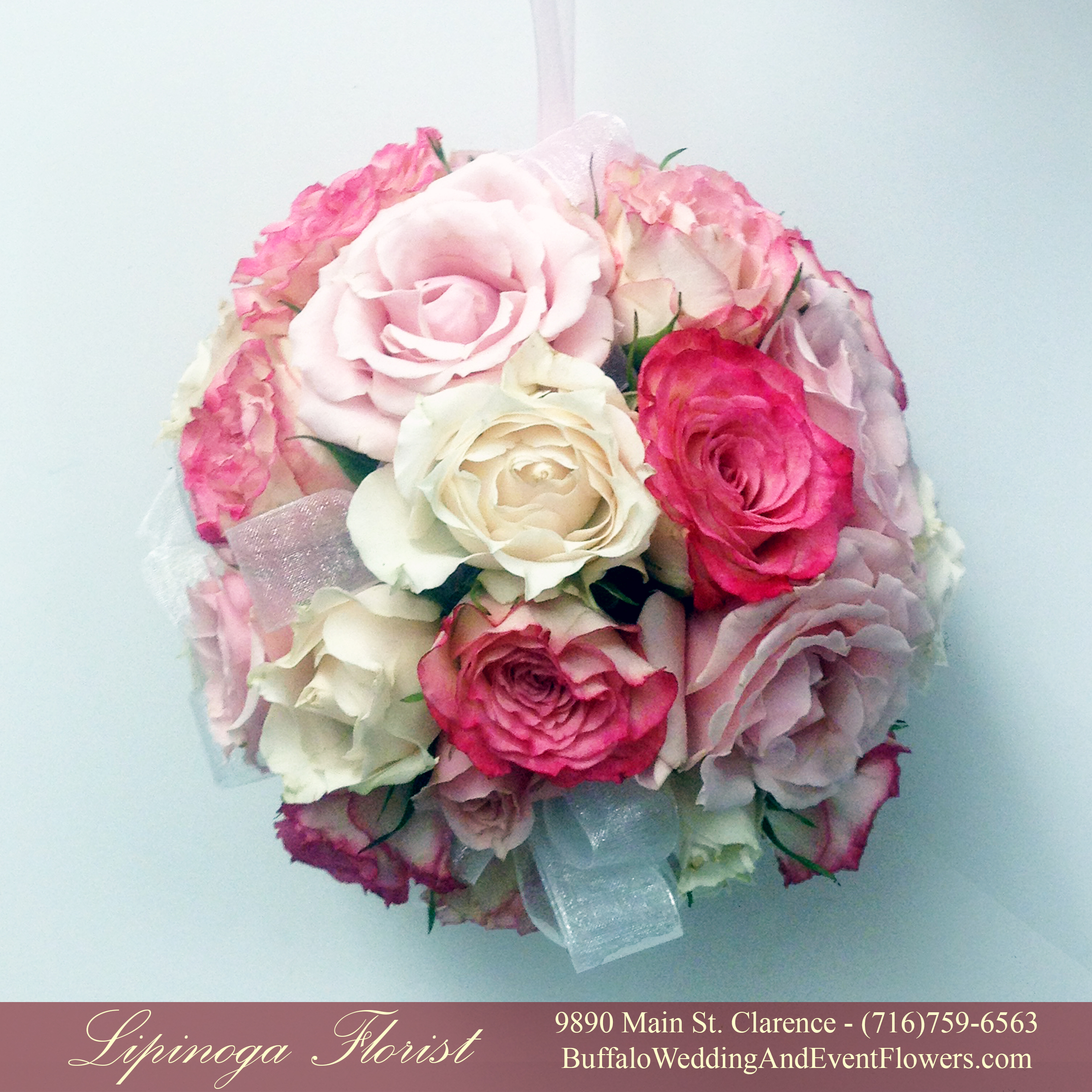 The Bride and Bridesmaids carried simple bouquets of ivory roses, mixed shades of light pink roses and white roses with a hot pink edge. The flower girl carried a pomander ball to coordinate.