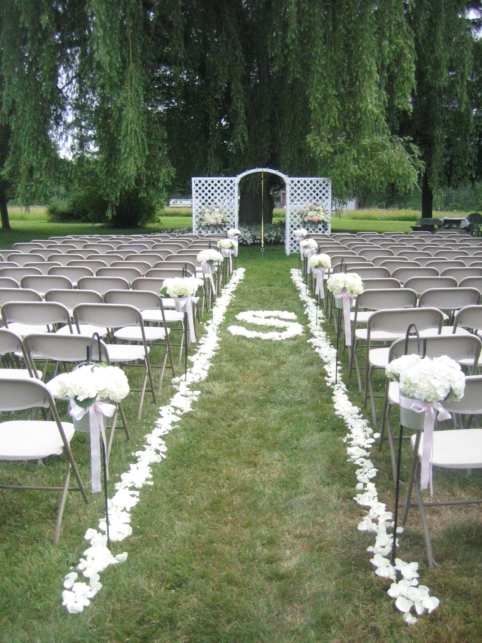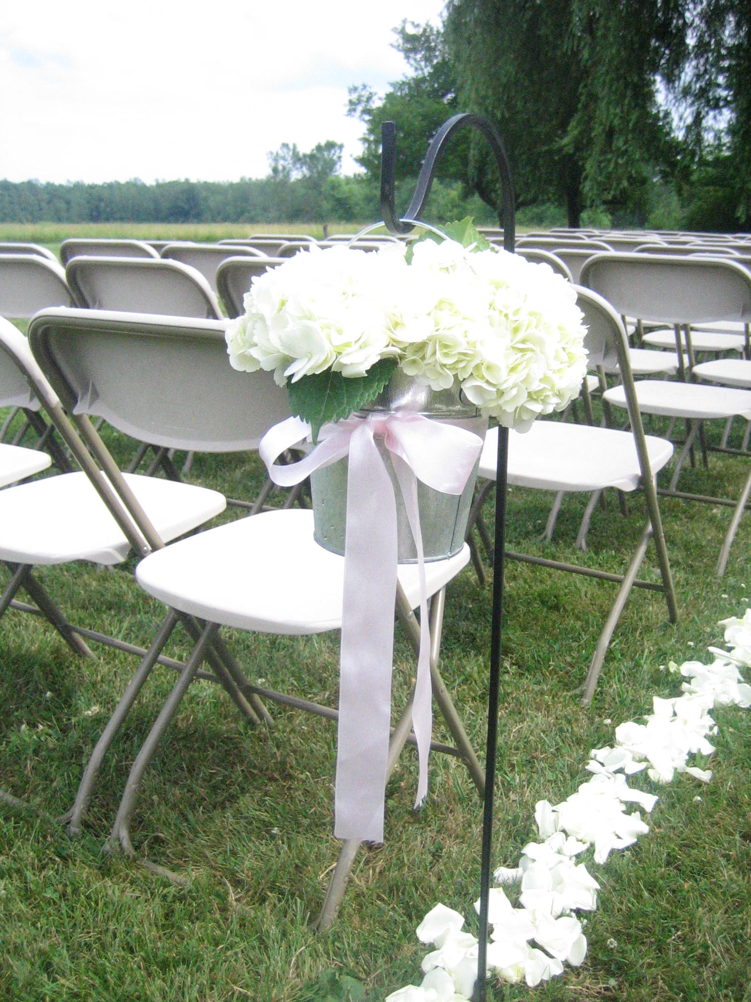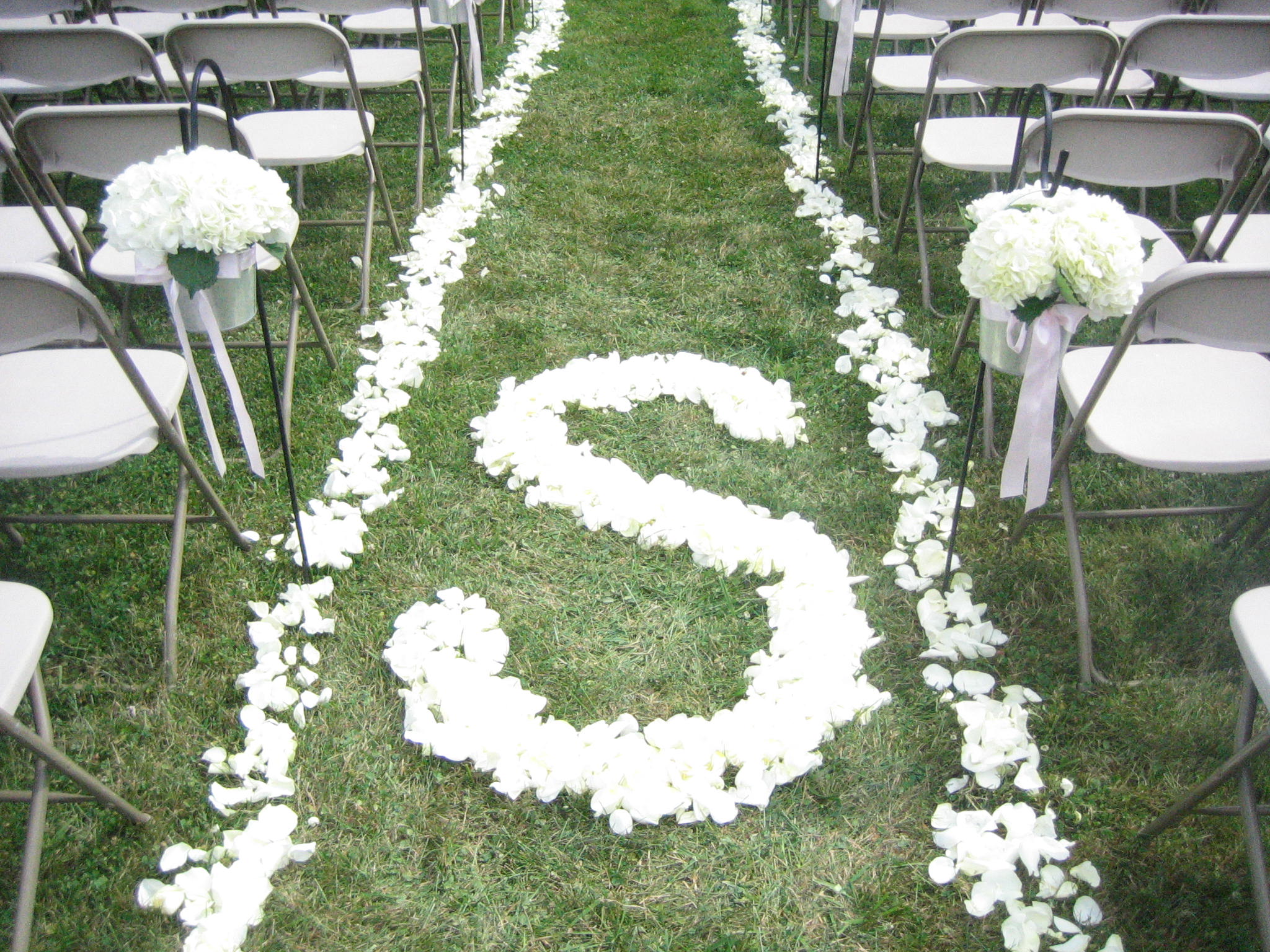The wedding shown above held at the Bride’s private residence in Clarence, NY shows how simple white petals pop against green grass to create a truly simple yet beautiful look. White roses petals line not only the aisle but also are used to create an “S” in the center of the aisle to symbolize the first letter of their last name. The aisle was also lined with galvanized buckets filled with hydrangea.
