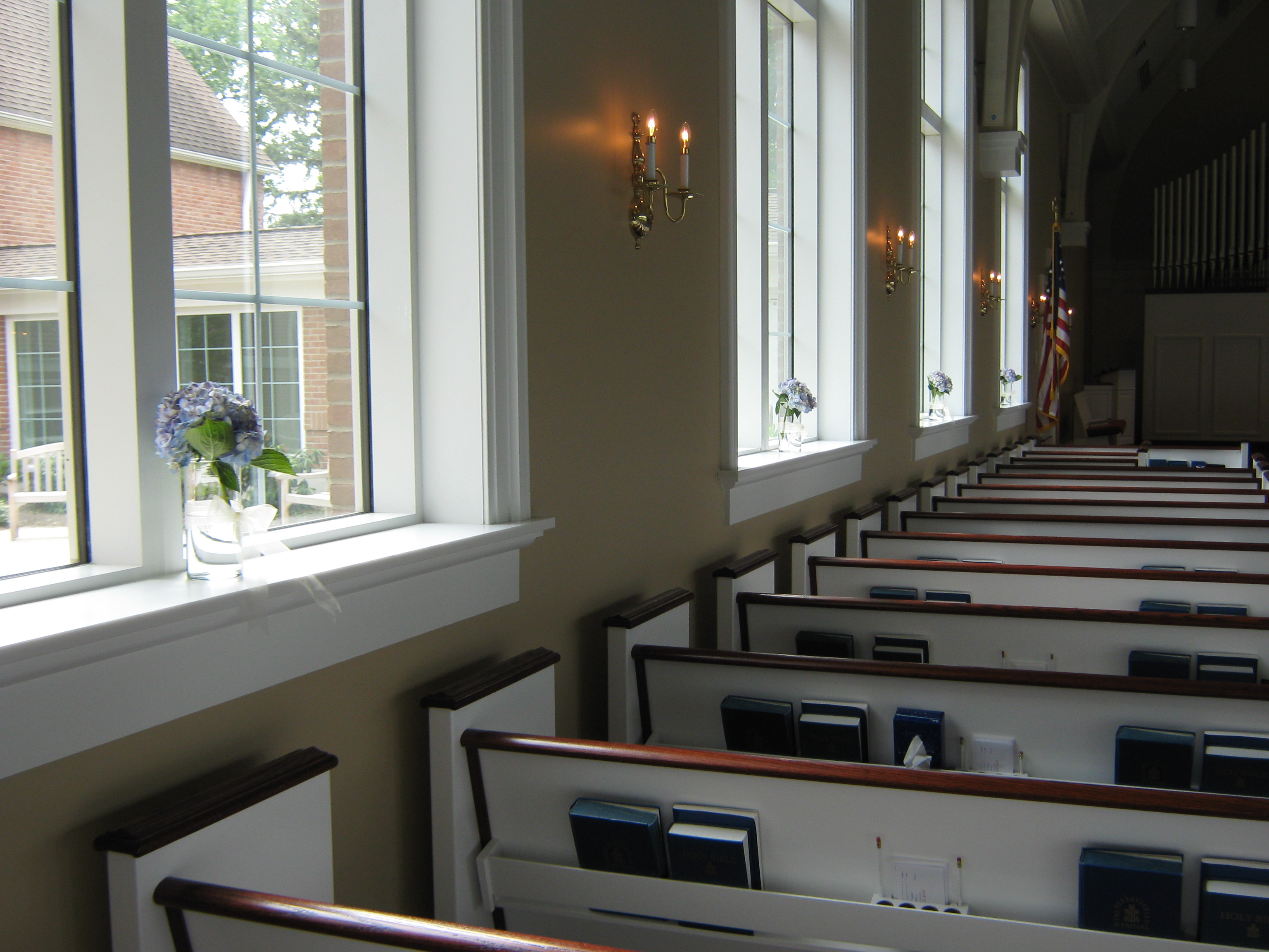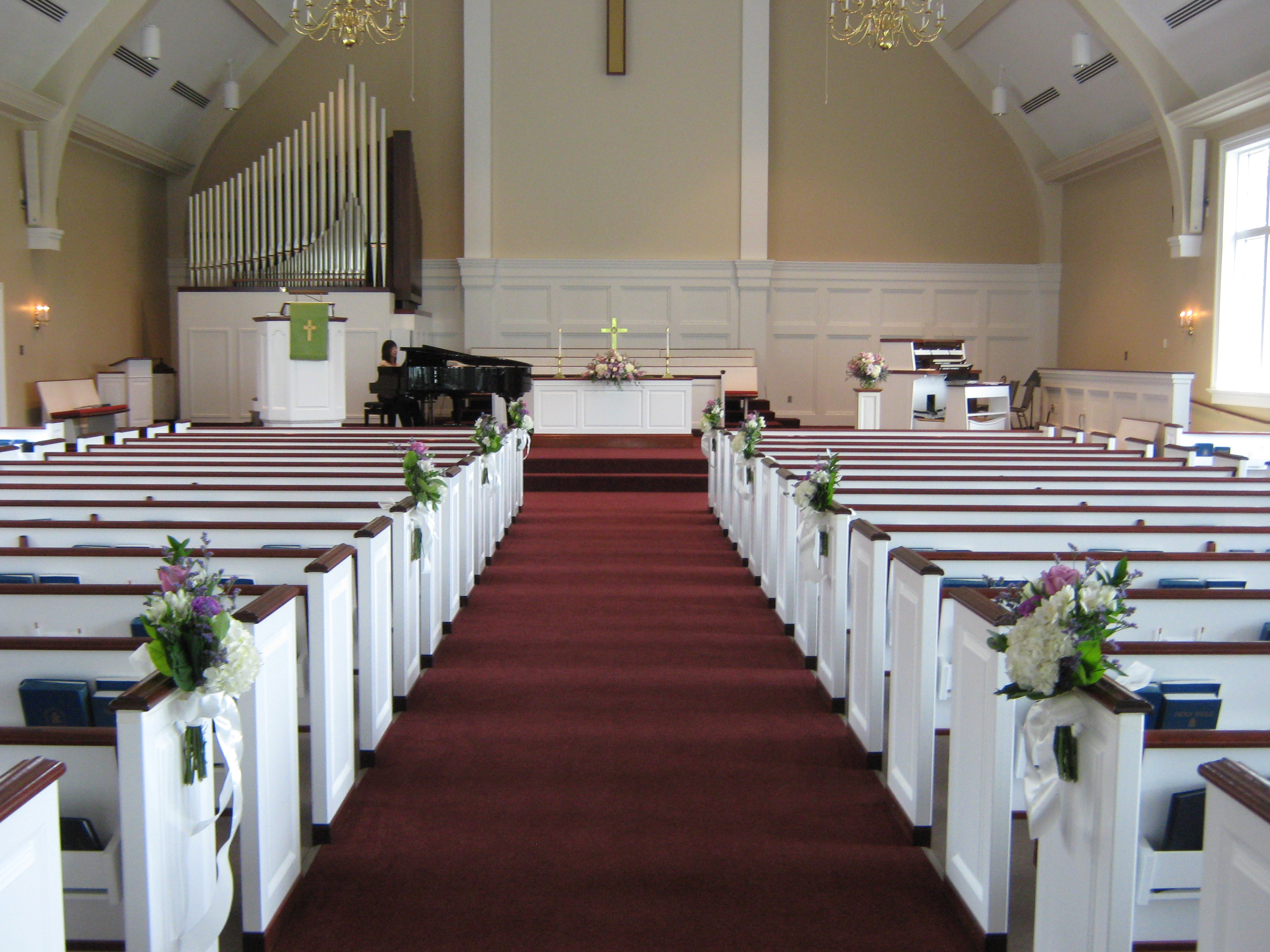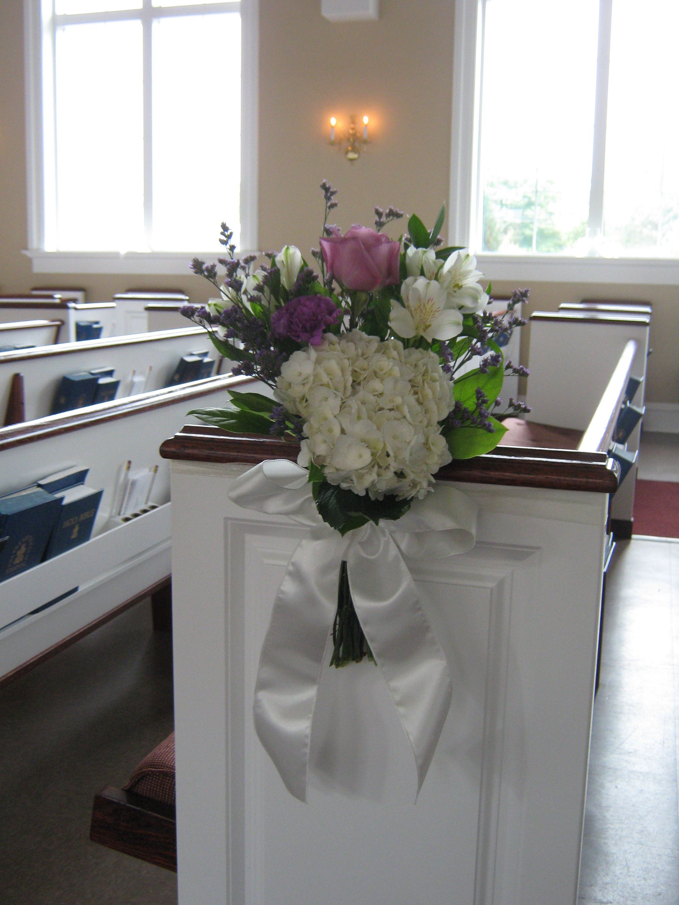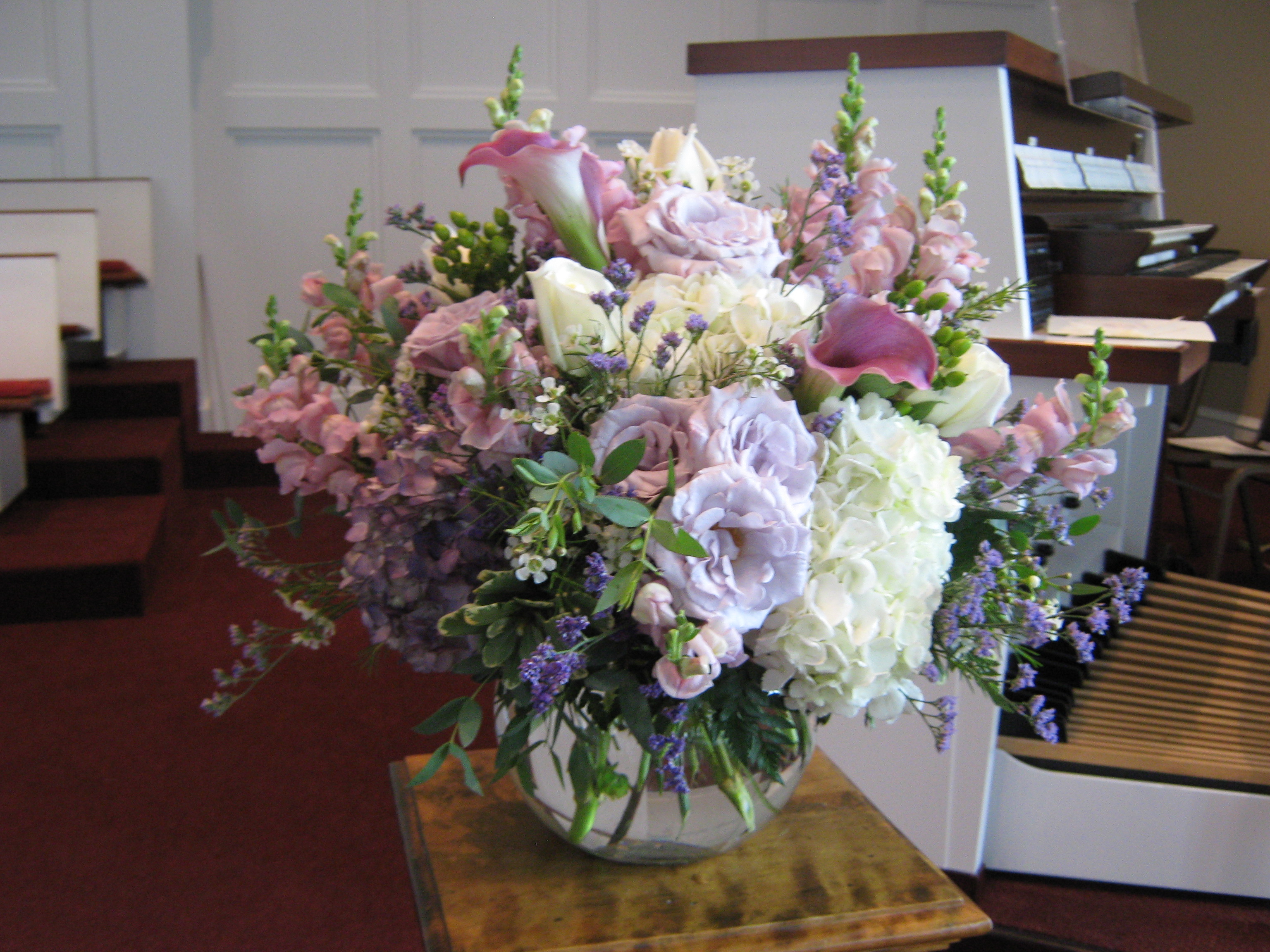 Large white calla lilies mixed with greenery and tied with a bow lined the aisle for the ceremony. The shelves on the back altar held two matching arrangements in gold urns.