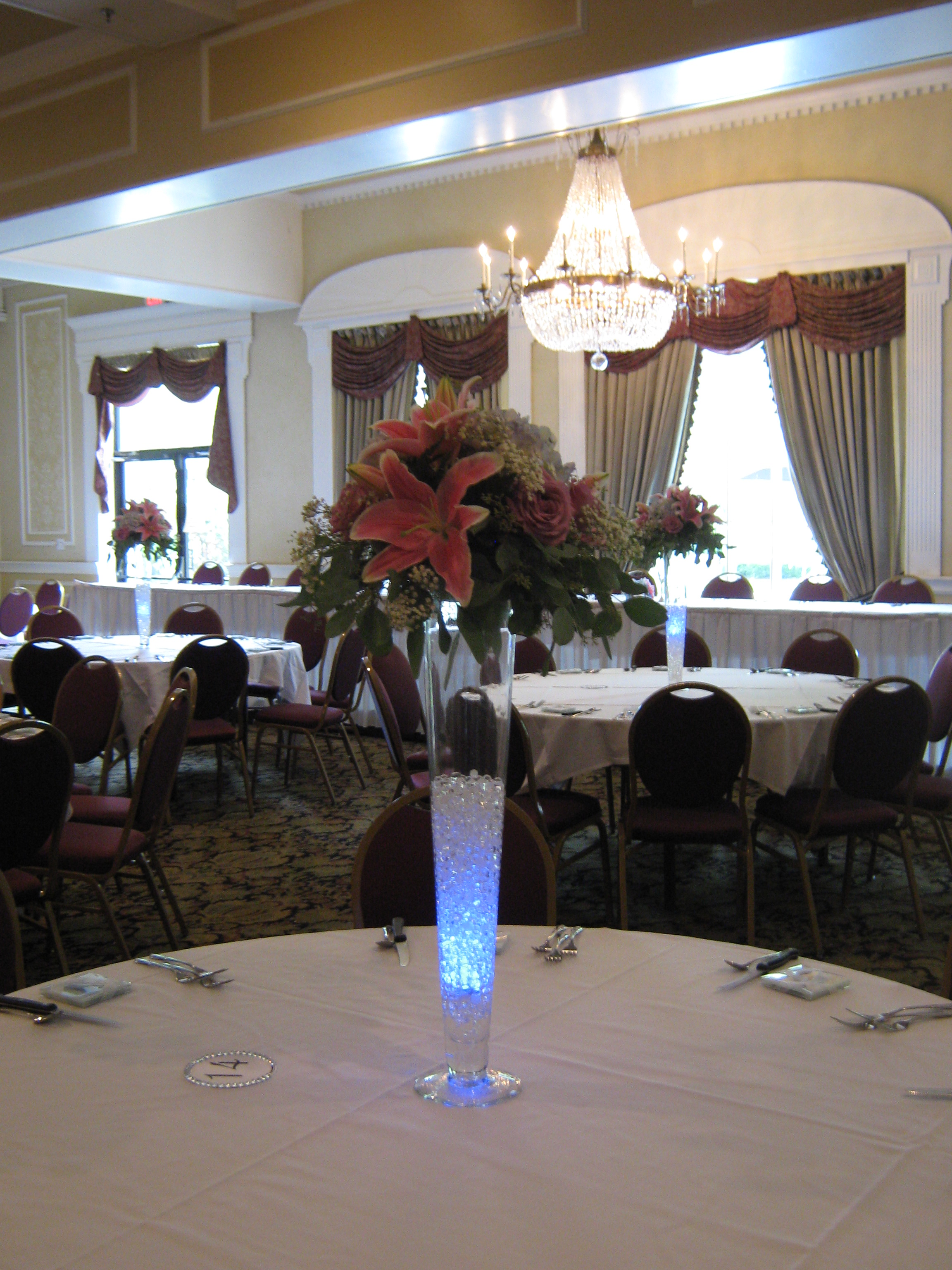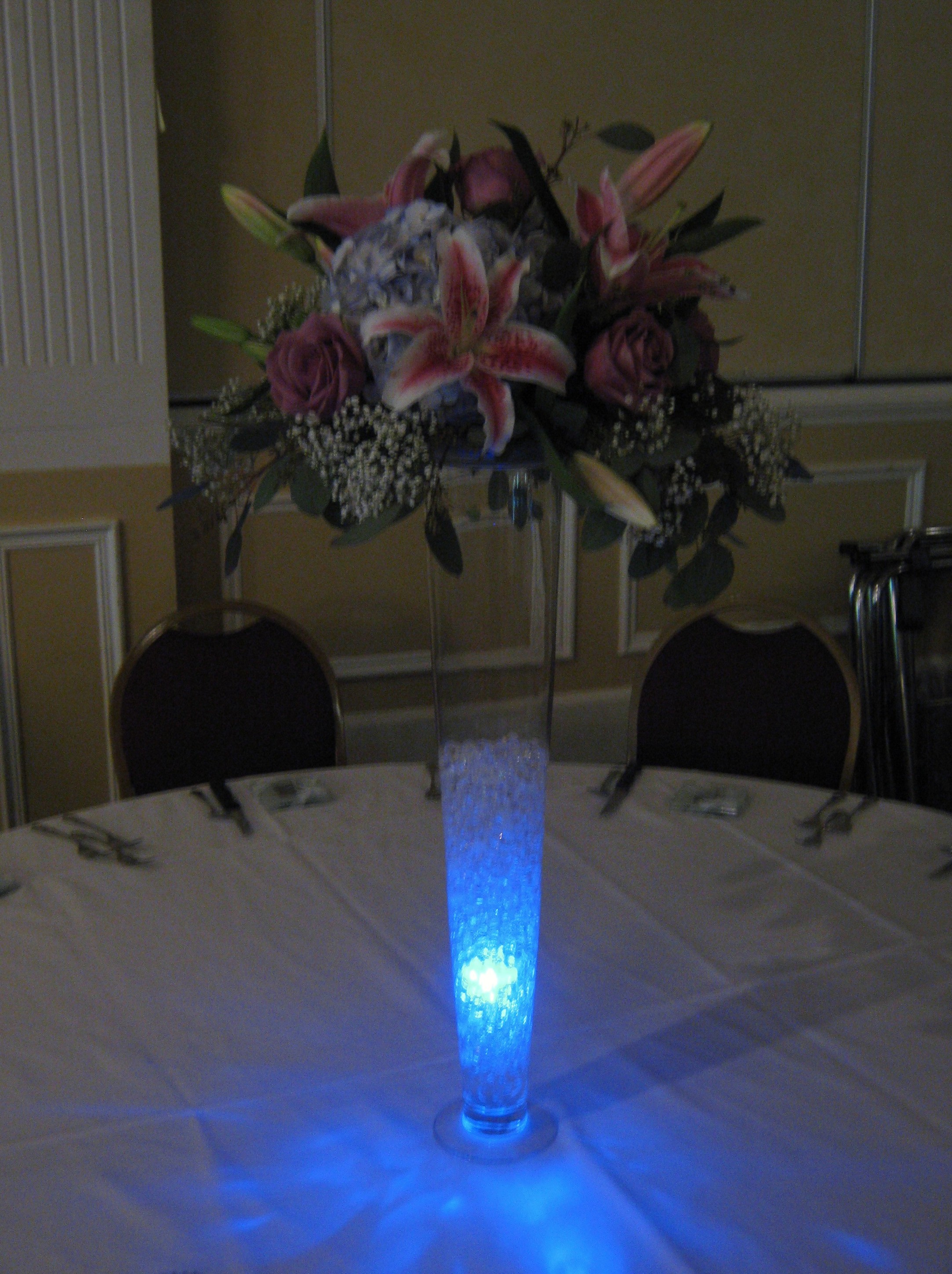 Pilsner vases(available for rent with centerpieces from Lipinoga Florist) held an arrangement of lilies, hydrangea, and roses, were accented by babies breath and an LED light in the vase.